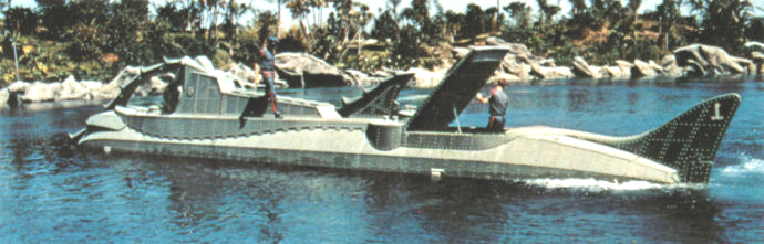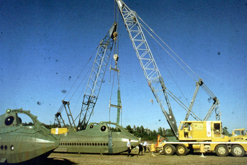 "Cranes - I think this photo is of the delivery of the last subs delivered in 1971. Note that there are features on the lower bow hull not on sub #1, and that a heat exchanger appears on the lower side aft of amidship." Bob Gurr, Imagineer