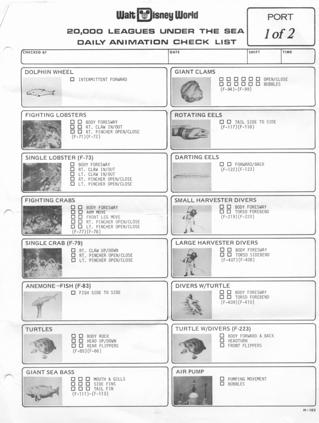 Page one of a survey checklist of all the motions for the animatronics. Sadly page two seems to have been lost forever.