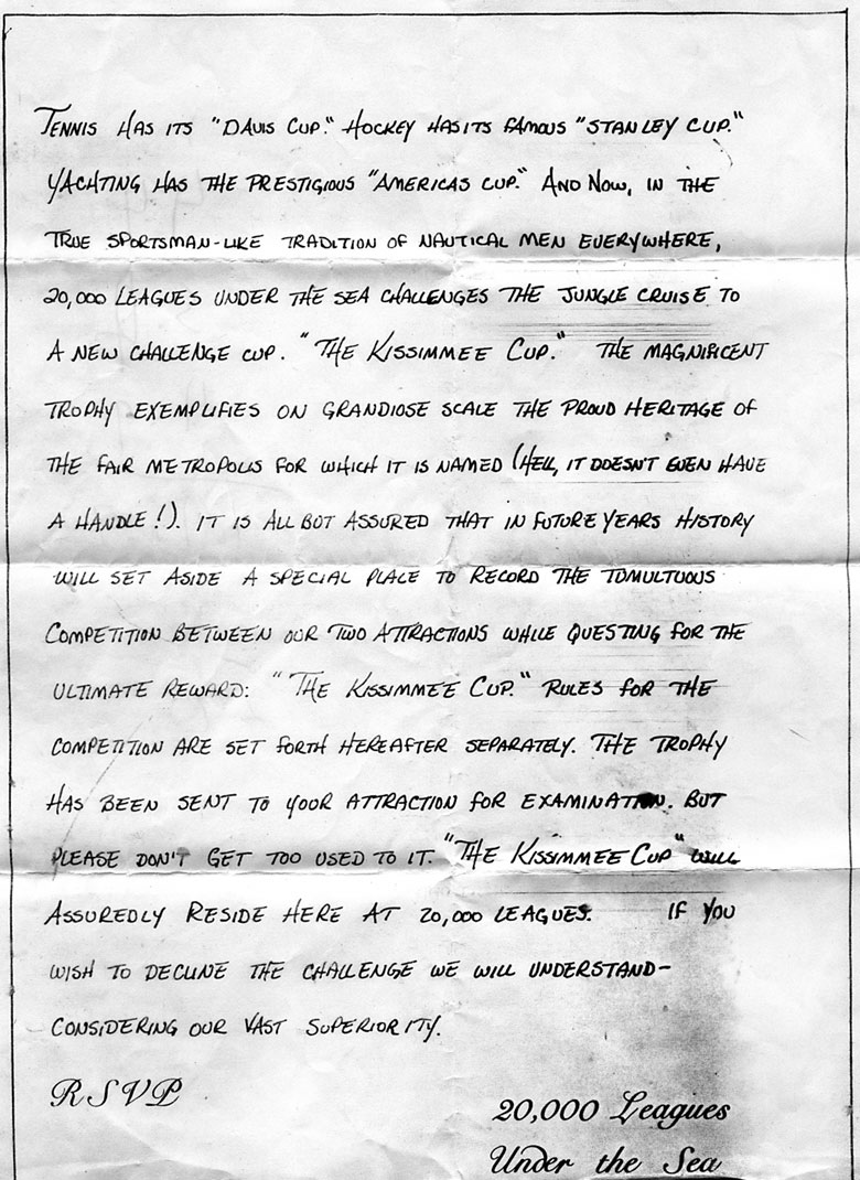 The 20Kers challenged the crew of the Jungle Cruise ride to a contest to see which could herd more people through their ride on a given day. The prize was the coveted Kissimmee Cup (a tin trophy) and a kegger thrown by the other ride's supervisor!