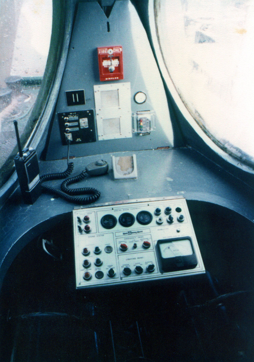 "George McGinnis designed a great looking control station to be visible to guests looking into the conning tower. The idea was that the subs would appear to be steered by the helmsman twirling the classic wheel mounted to a brass binnacle complete with fancy Jules Verne levers and such. After the prototype set up was partially built, George was ordered to stop any further "themed" design and let the electrical department just put in some modern switches instead. I felt kind of sad about this and kept the parts in my office for years. So these pieces never got launched but do survive today." Bob Gurr, 71 year old 20K helmsman.