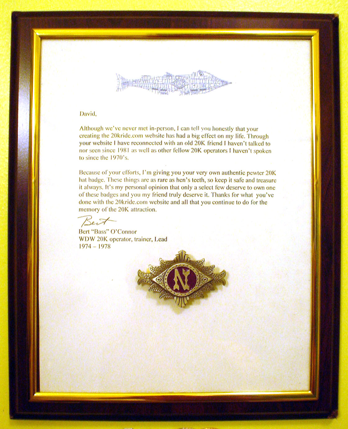 Here's the sweet metal buckle that 20Kers wore on their hats for a few years before Disney switched to cloth emblems because so many were disappearing. Bert lost track of his original and had to pay the big bucks to get this one on ebay.