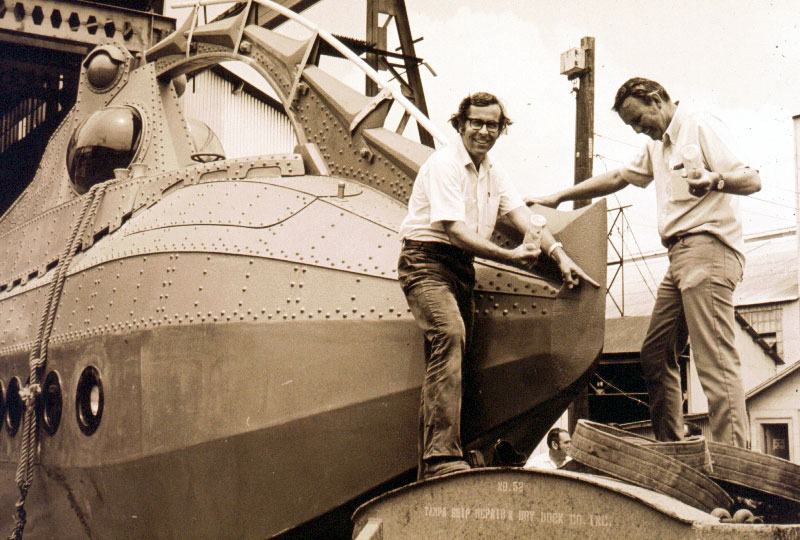 "Sub Christening - Jack Gladish, MAPO Plastics Manufacturing Manager (right) and I (Bob Gurr, left) are about to whack the Sub prow with empty whiskey bottles just after the First 20K completed Submarine was loaded on a trailer carrier for delivery to Walt Disney World from Tampa Shipyard in August 1971." Bob Gurr, Imagineer